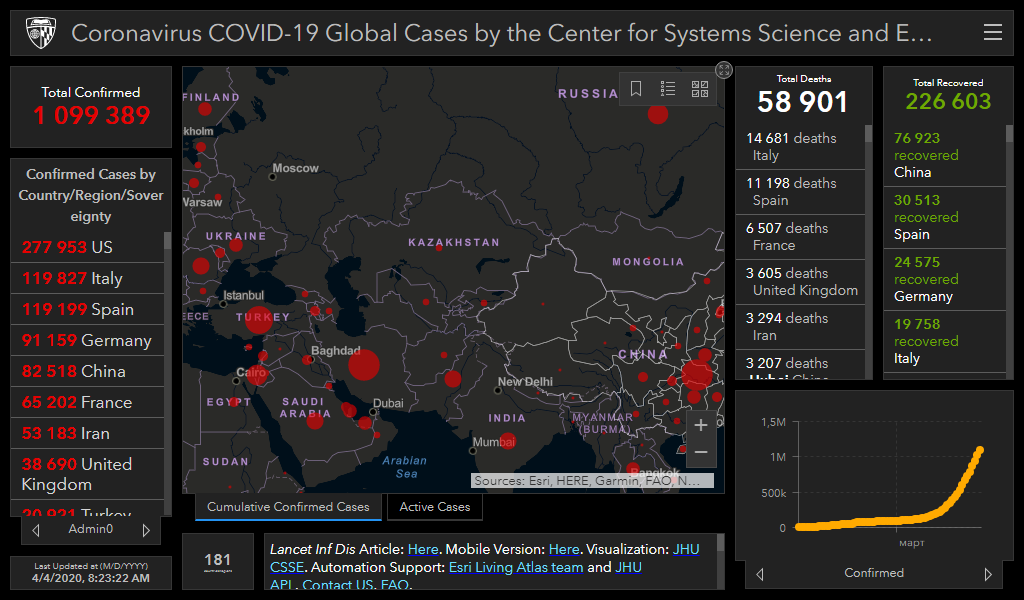 На сегодня в мире зафиксировали 1 миллион 99 тысяч 389 случаев заражение коронавирусом. Вне Китая отмечен 1 миллион случаев, а в самой республике— 82 тысячи 518.