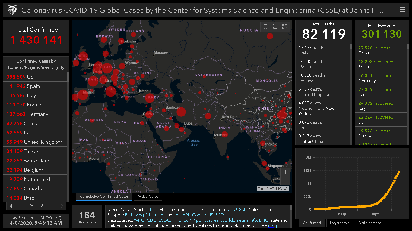 На сегодня в мире число людей, которые заразились новым коронавирусом, составило 1 миллион 430 тысяч 141. Об этом свидетельствуют данные онлайн-карты, разработанной учеными.