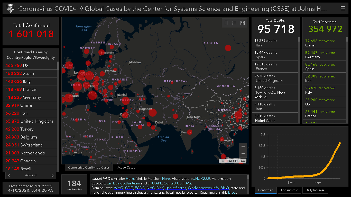 После заражения коронавирусом скончались 95 тысяч 718 человек (рост на 7 тысяч 180 за сутки). В том числе в Италии умерли 17 тысяч 669 человек, в Испании — 14 тысяч 792, во Франции — 10 тысяч 869.