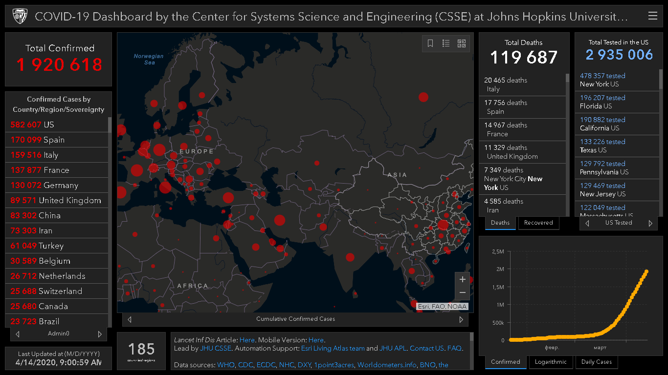 На сегодня случаи заболевания вирусом зафиксированы у 1 миллиона 920 тысяч 618 человек. Больше всего зараженных в США (582 тысячи 607), Испании (170 тысяч 99), Италии (159 тысяч 516), Франции (137 тысяч 877), Германии (130 тысяч 72) и Великобритании (89 тысяч 571).