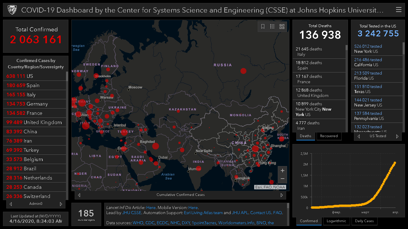 Число людей, которые заразились новым коронавирусом, достигло 2 миллионов 63 тысяч 121 человека. Об этом свидетельствуют данные онлайн-карты, разработанной учеными.