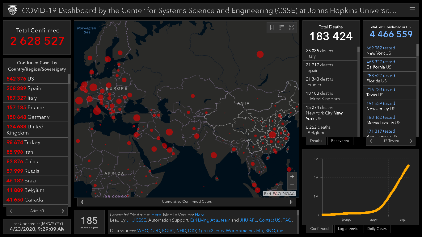 На сегодня в мире зафиксировали 2 миллиона 628 тысяч 527 случаев заражения коронавирусом. Об этом свидетельствуют данные онлайн-карты, разработанной учеными.
