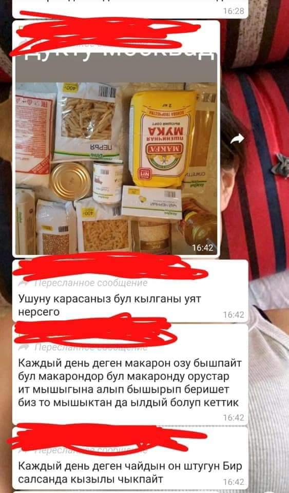 «Макароны «Каждый день» плохо варятся. Эти макароны россияне дают своим кошкам и собакам. Получается, мы ниже их. Заберите завтра все, что принесли, отдайте тем, у кого совсем нет продуктов. Мука хорошая, остальное заберите», — пишут кыргызстанцы.