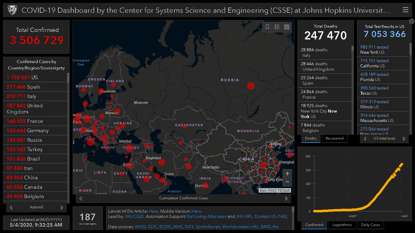 Всего в мире коронавирусом заразились 3 миллиона 506 тысяч 729 человек. Больше всего зараженных в США (1 миллион 158 тысяч 41), Испании (217 тысяч 466), Италии (210 тысяч 717), Великобритании (187 тысяч 842), Франции (168 тысяч 925), Германии (165 тысяч 664) и России (134 тысячи 687).
