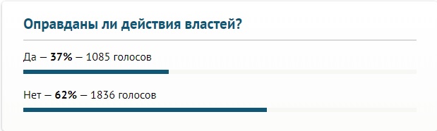 На этот раз наоборот, большинство ответили «нет». 62 процента проголосовавших — 1 тысяча 836 человек — считают действия властей неоправданными.