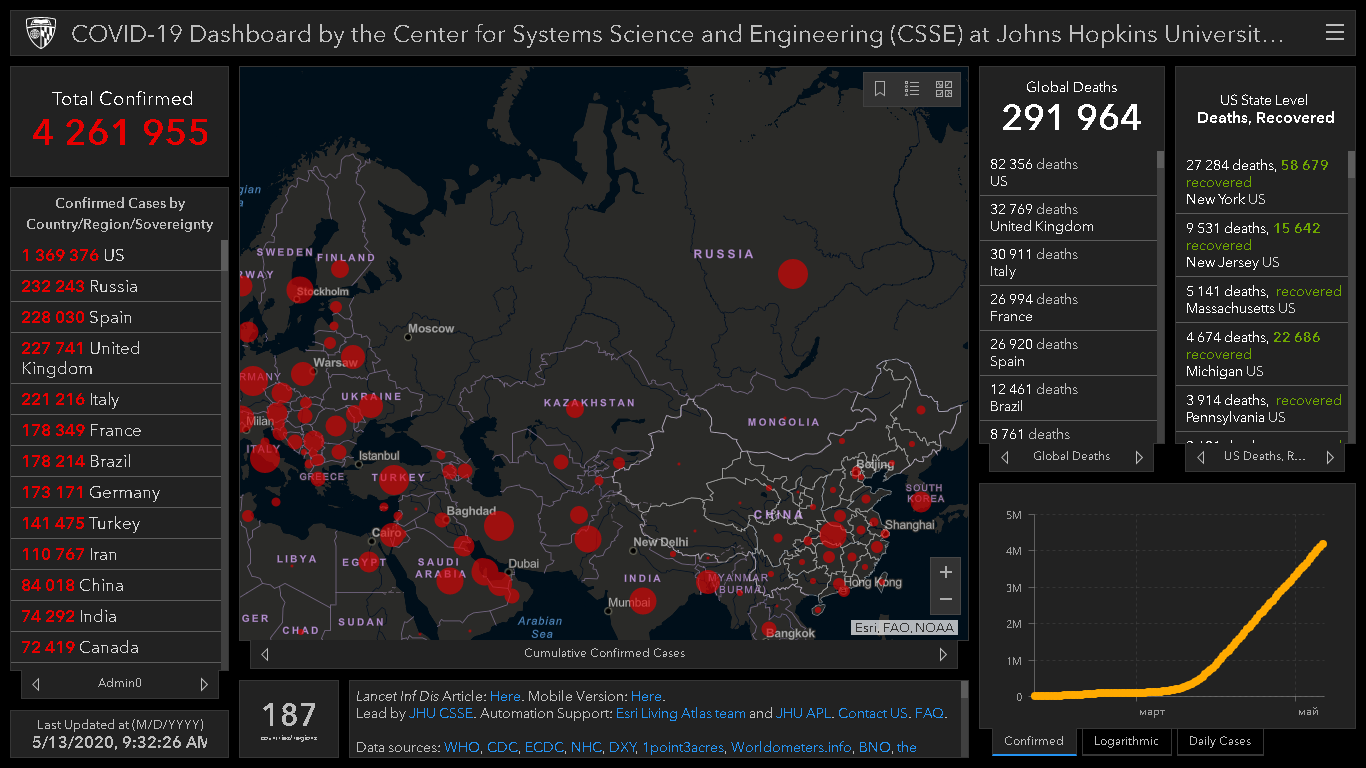 Всего в мире коронавирусом заразились 4 миллиона 261 тысяча 955 человек. Больше всего зараженных в США (1 миллион 369 тысяч 574), России (232 тысячи 243), Испании (228 тысяч 30), Великобритании (227 тысяч 741), Италии (221 тысяча 216), Франции (178 тысяч 349) и Бразилии (178 тысяч 214).