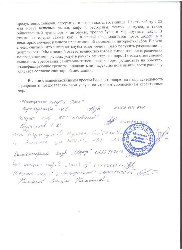 «Предоставленный коммерческими банками трехмесячный срок отсрочки по платежам истекает в июне. Простой для нас сейчас крайне губителен и впоследствии может привести к банкротству и закрытию бизнес-объектов. С 21 мая начали работать центры обслуживания населения, предприятия, оказывающие услуги населению, торговые центры, магазины по продаже непродуктовых товаров, авторынки и рынки скота, гостиницы. С 25 мая — вещевые рынки, кафе и рестораны, театры и музеи, а также общественный транспорт — автобусы, троллейбусы и маршрутные такси. В указанных сферах, так же, как и в нашей, предполагается поток людей, а в некоторых случаях намного превышающий посещение интернет-клубов. В связи с чем считаем, что интернет-клубы тоже имеют право получить разрешение на деятельность», — подчеркивается в обращении.
