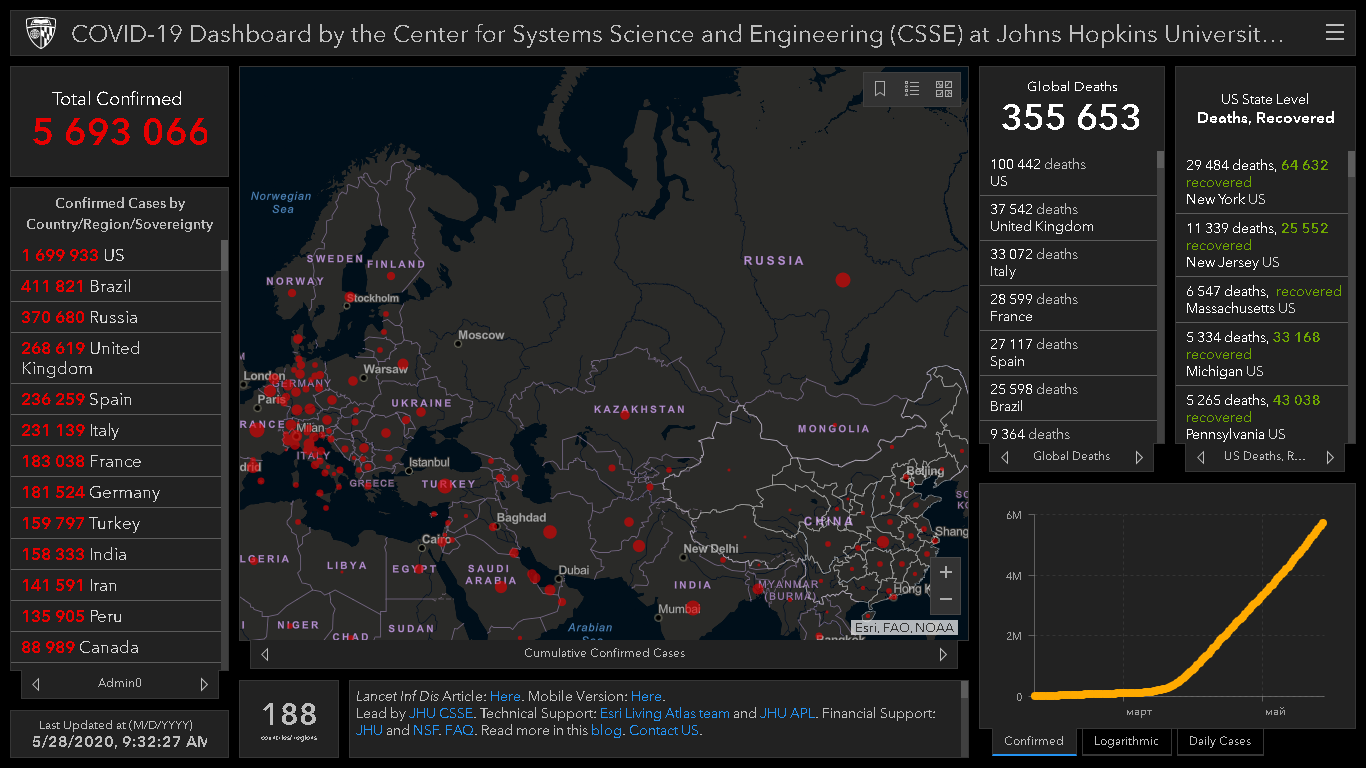 Всего в мире коронавирусом заразились 5 миллионов 693 тысячи 66 человек. Больше всего зараженных в США (1 миллион 699 тысяч 933), Бразилии (411 тысяч 821), России (370 тысяч 680), Великобритании (268 тысяч 619), Испании (236 тысяч 259), Италии (231 тысяча 139) и Франции (183 тысячи 38).