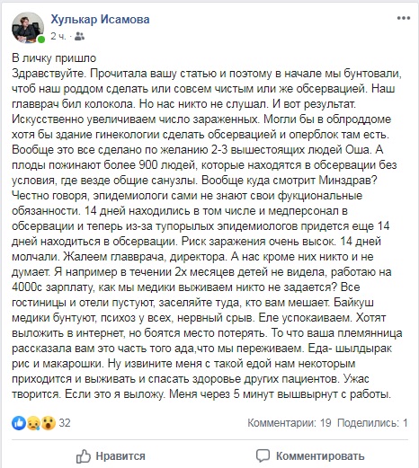 «Но нас никто не услышал. И вот результат. Искусственно увеличиваем число зараженных... Вообще, это все сделано по желанию двух-трех вышестоящих людей Оша, а плоды пожинают более 900 людей, которые находятся в обсервации без условий, где общие санузлы. Куда смотрит Минздрав? Честно говоря, эпидемиологи сами не знают свои функциональные обязанности», — пишут медики.