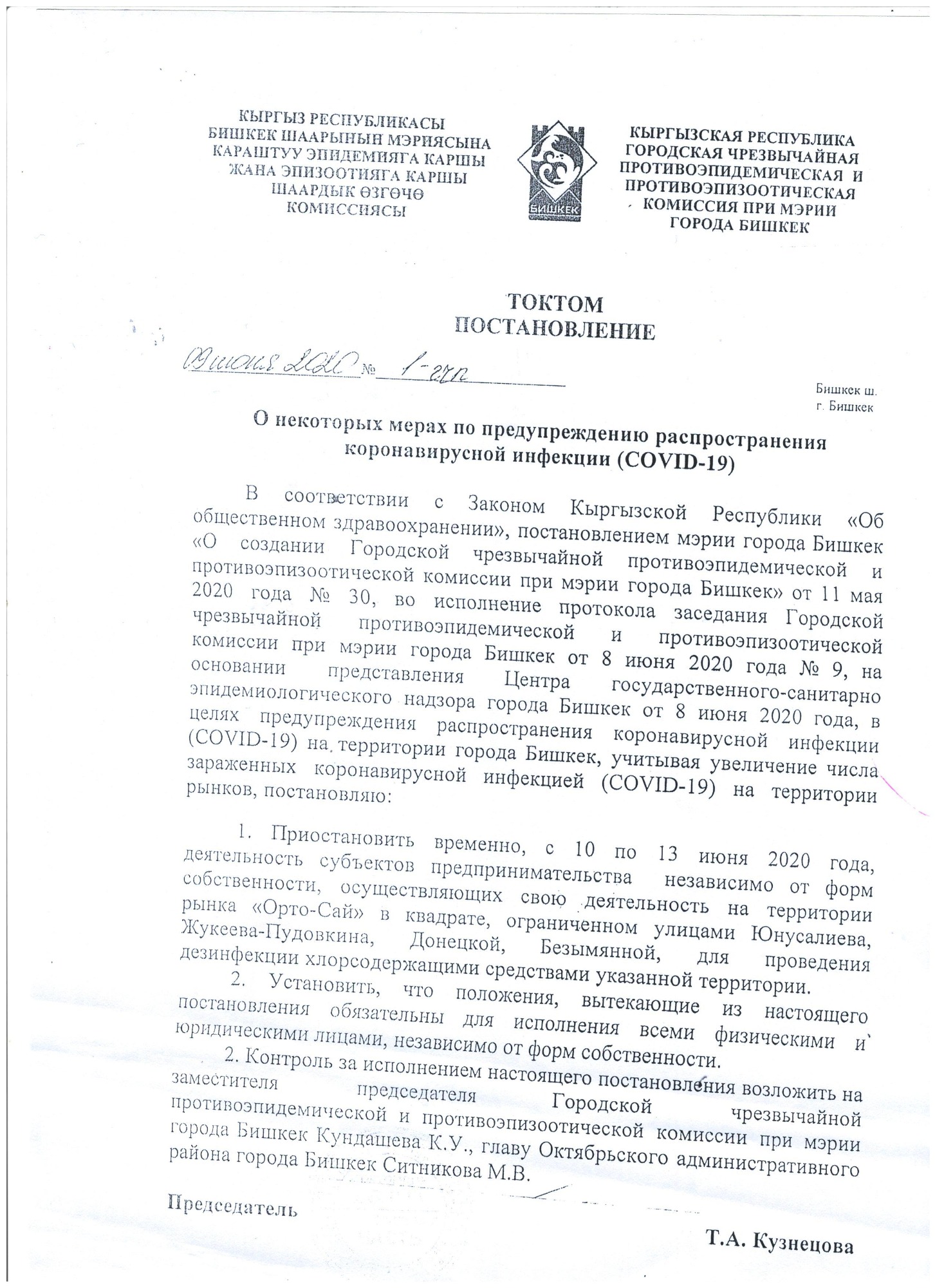 По ее данным, постановление подписала глава городской чрезвычайной противоэпидемической и противоэпизоотической комиссии, вице-мэр столицы Татьяна Кузнецова.