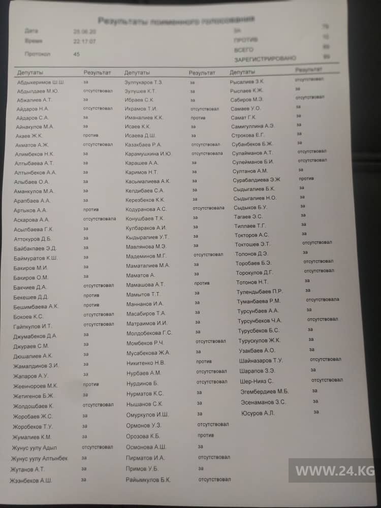 Только 10 депутатов выступили против: Мирлан Жеенчороев, Жанар Акаев, Наталья Никитенко, Анвар Артыков, Карамат Орозова, Айгерим Бешимбаева, Дастан Бекешев, Эльвира Сурабалдиева, Айсулуу Мамашова и Каныбек Иманалиев.