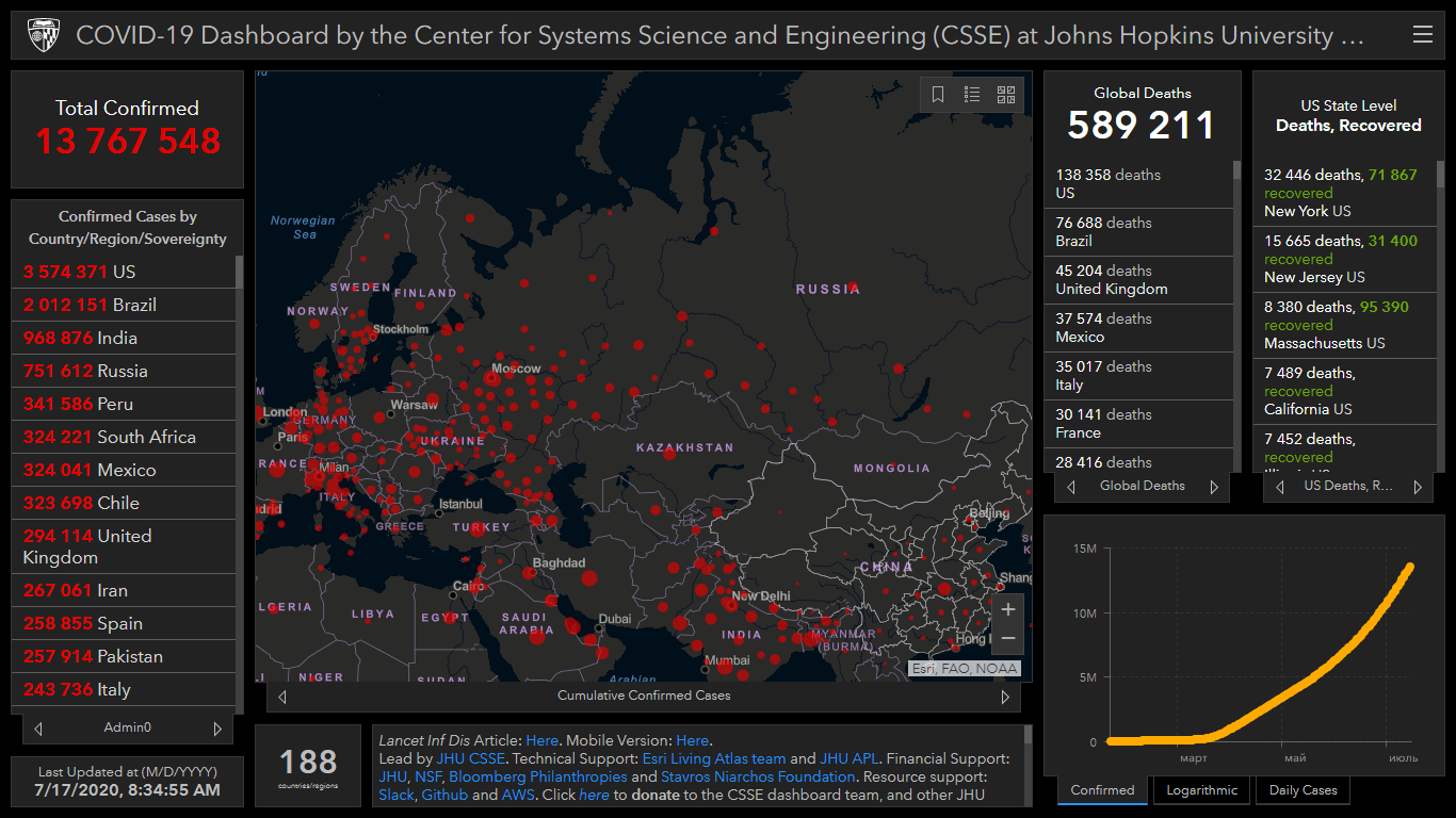 Всего в мире коронавирусом заразились 13 миллионов 767 тысяч 548 человек. Больше всего зараженных в США (3 миллиона 574 тысячи 371), Бразилии (2 миллиона 12 тысяч 151), Индии (968 тысяч 876), России (751 тысяча 612), Перу (341 тысяча 586), Южной Африке (324 тысячи 221), Мексике (324 тысячи 41), Чили (323 тысячи 698) и Великобритании (294 тысячи 114).