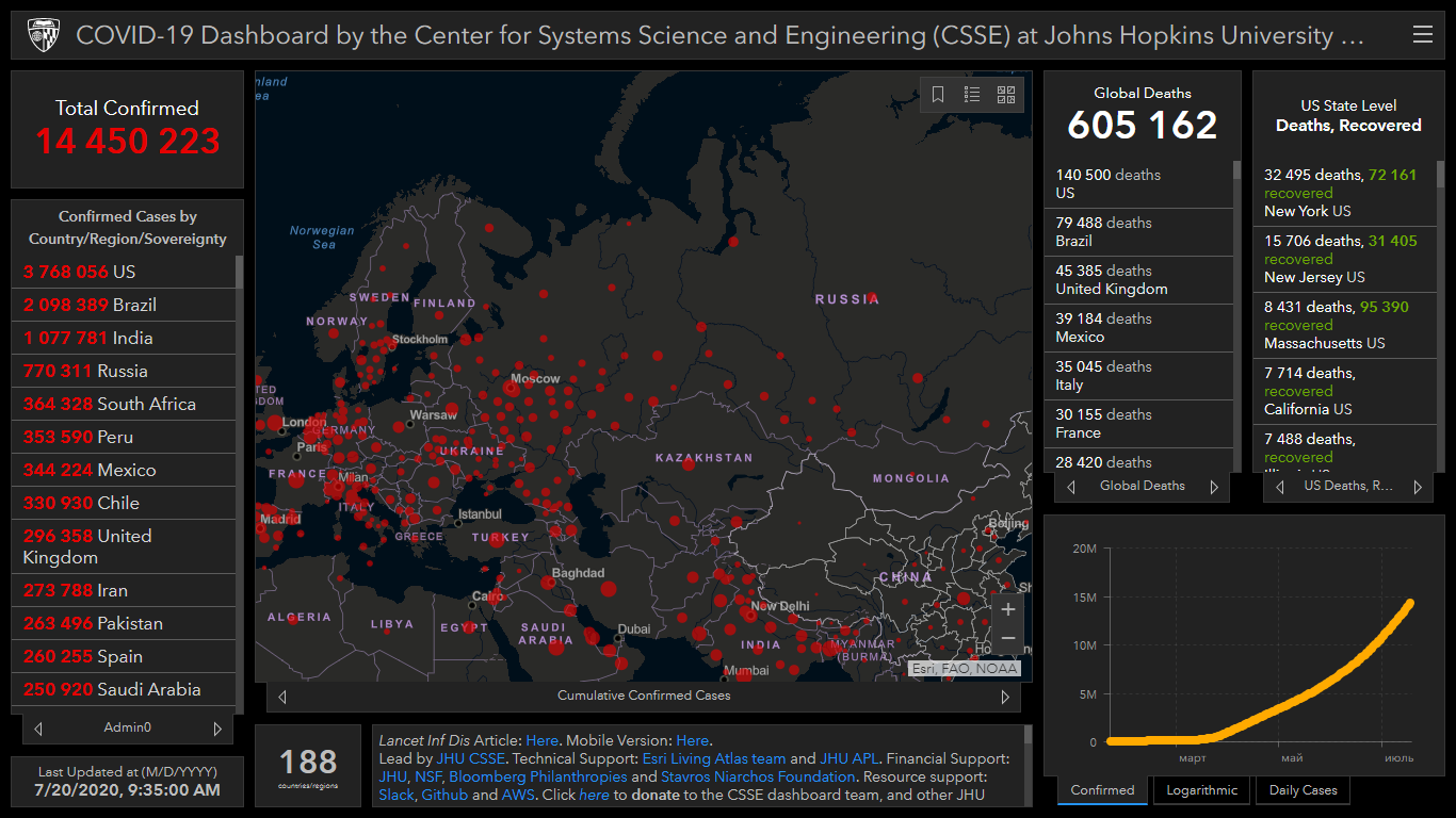 Всего в мире коронавирусом заразились 14 миллионов 450 тысяч 223 человека. Больше всего зараженных в США (3 миллиона 768 тысяч 56), Бразилии (2 миллиона 98 тысяч 389), Индии (1 миллион 77 тысяч 781), России (770 тысяч 311), Южной Африке (364 тысячи 328), Перу (353 тысячи 590), Мексике (344 тысячи 224), Чили (330 тысяч 930) и Великобритании (296 тысяч 358).