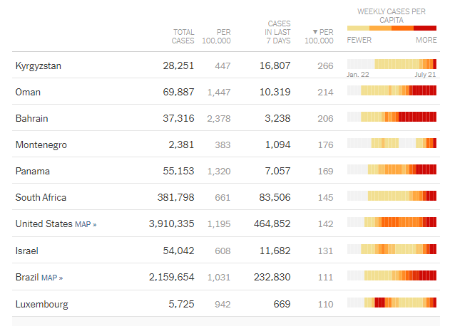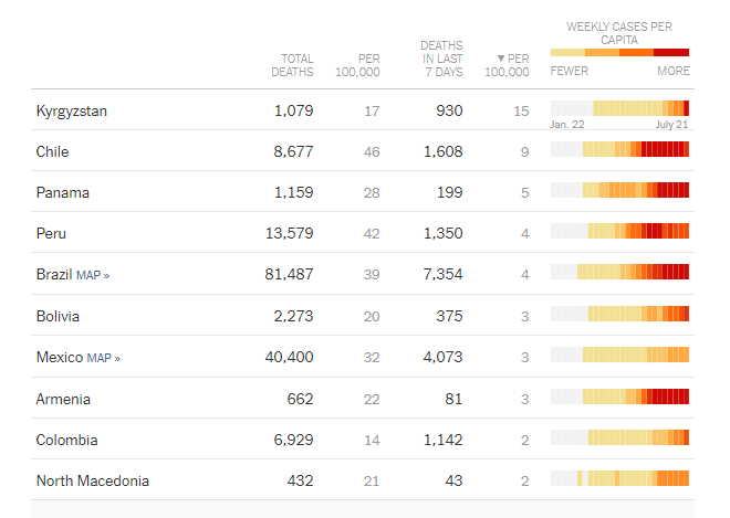 Следом за КР в списке по количеству случаев идут Оман (10 тысяч 319), Бахрейн (3 тысячи 238), Черногория (1 тысяча 94) и Панама (7 тысяч 57), а по количеству смертей — Чили (1 тысяча 608), Панама (199), Перу (1 тысяча 350) и Бразилия (7 тысяч 354).
