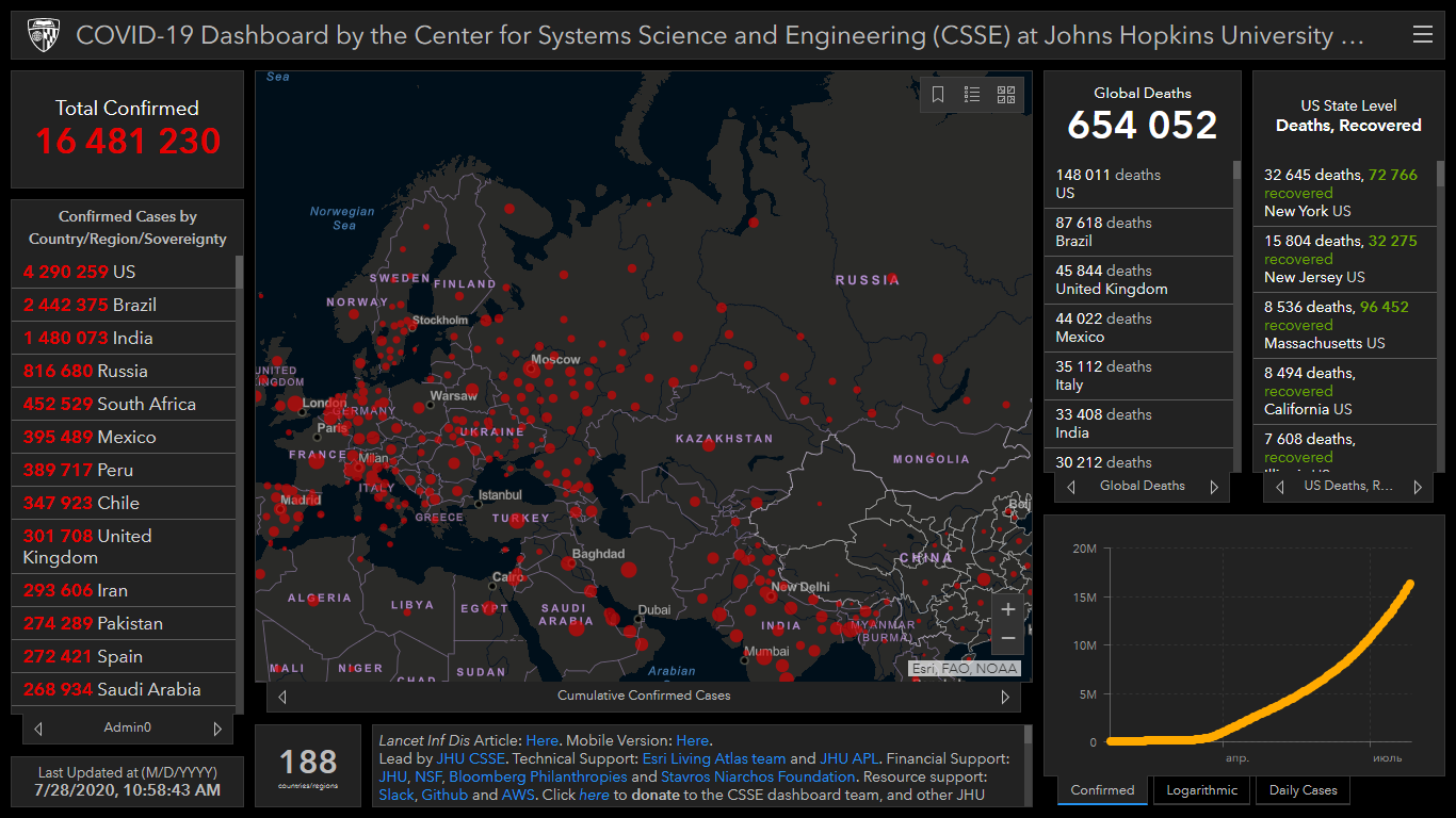 Всего в мире коронавирусом заразились 16 миллионов 481 тысяча 230 человек. Больше всего зараженных в США (4 миллиона 290 тысяч 259), Бразилии (2 миллиона 442 тысячи 375), Индии (1 миллион 480 тысяч 73), России (816 тысяч 680), Южной Африке (452 тысячи 529), Мексике (395 тысяч 489), Перу (389 тысяч 717), Чили (347 тысяч 923) и Великобритании (301 тысяча 708).