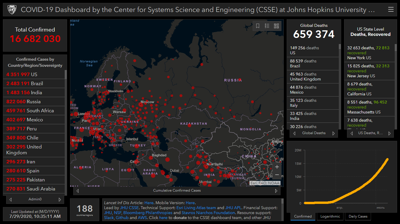 Всего в мире коронавирусом заразились 16 миллионов 682 тысячи 30 человек. Больше всего зараженных в США (4 миллиона 351 тысяча 997), Бразилии (2 миллиона 483 тысячи 191), Индии (1 миллион 483 тысячи 156), России (822 тысячи 60), Южной Африке (459 тысяч 761), Мексике (402 тысячи 697), Перу (389 тысяч 717), Чили (349,8 тысячи) и Великобритании (302 тысячи 295).