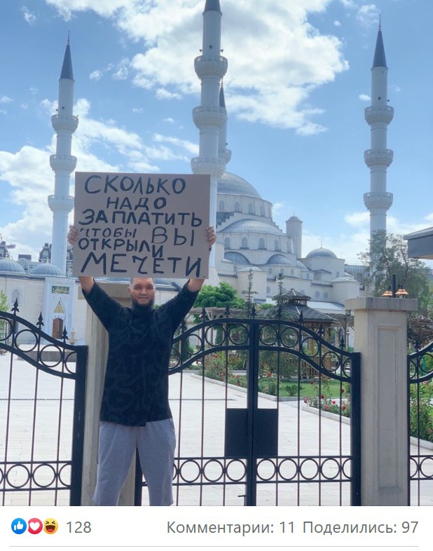 Активист на опубликованной им фотографии держит плакат с надписью: «Сколько надо заплатить, чтобы вы открыли мечети?».
