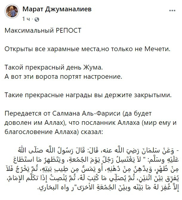 Он считает, что открылись все харамные места, но только не мечети.⁣⁣ «Такой прекрасный день жума.⁣⁣ А вот эти ворота портят настроение.⁣⁣ Такие прекрасные награды вы держите закрытыми», — написал Марат Джуманалиев.