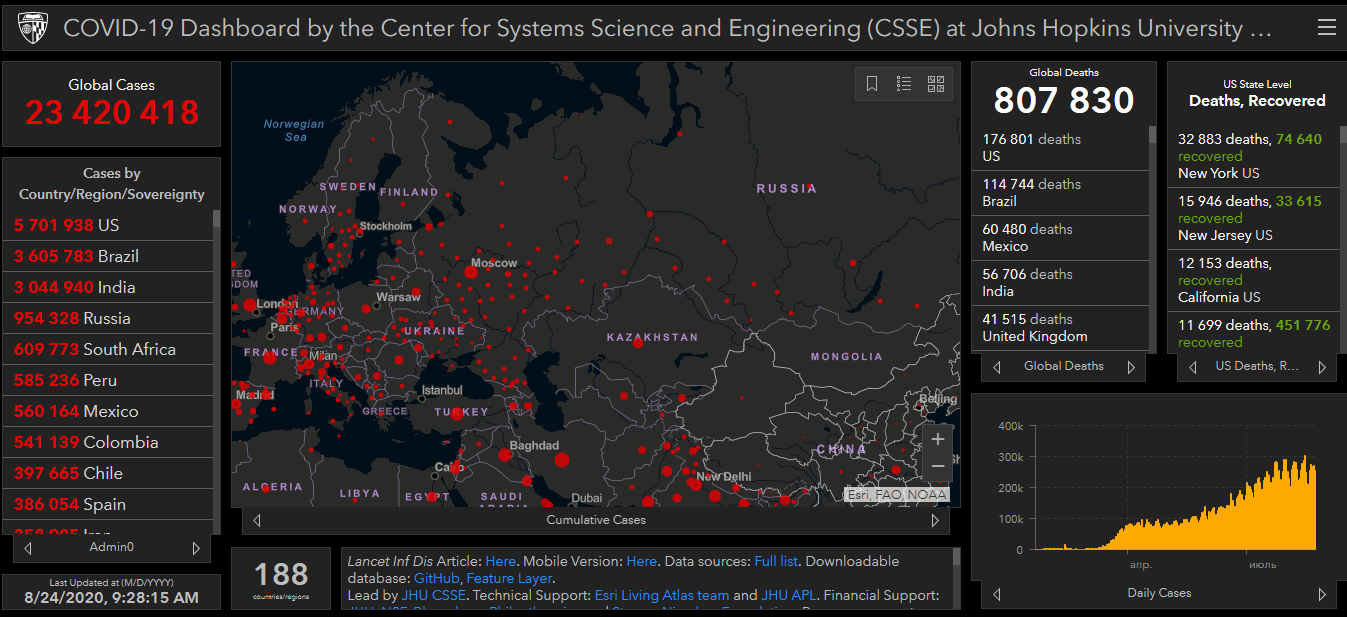 Всего в мире коронавирусом заразились 23 миллиона 420 тысяч 418 человек. Больше всего зараженных в США (5 миллионов 701 тысяча 938), Бразилии (3 миллиона 605 тысяч 783), Индии (3 миллиона 44 тысячи 940), России (954 тысячи 328), Южной Африке (609 тысяч 773), Перу (585 тысяч 236), Мексике (560 тысяч 164), Колумбии (541 тысяча 139) и Чили (397 тысяч 665).