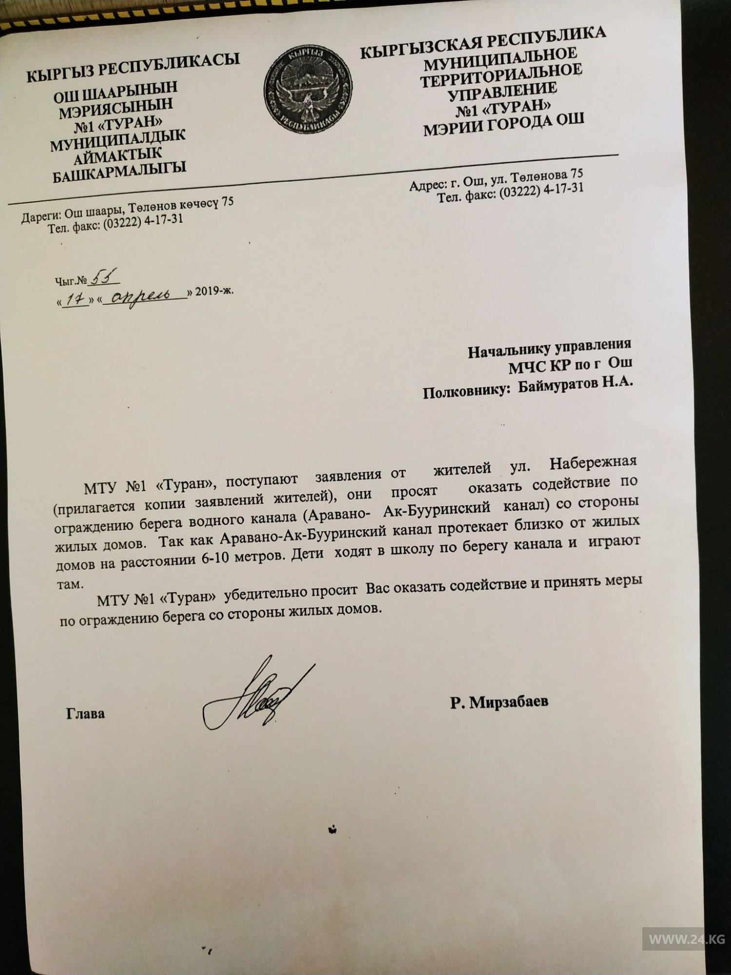 Жительница Оша Мээрим Асанова отправила редакции обращение главы МТУ «Туран» Равшана Мирзабаева от 17 апреля 2019 года в МЧС, где он просит принять меры по ограждению канала.