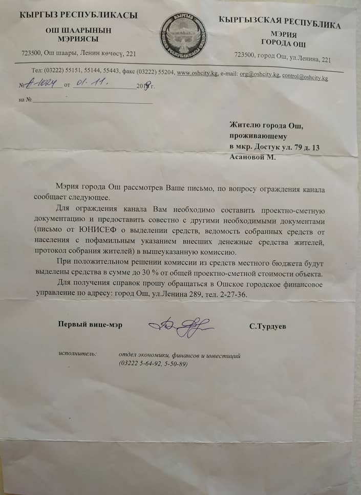 Она отметила, что мэрия Оша в 2019 году письменно сообщила о готовности выделить нужную сумму с условием составить проектно-сметную документацию и предоставить необходимые документы (письмо от ЮНИСЕФ о выделении средств, ведомость собранных средств от населения для ограждения канала).