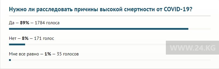 Читатели 24-kg.com с ним солидарны. По итогам проведенного опроса 89 процентов (1 тысяча 784 человека) проголосовали за проведение расследования по высокой смертности от коронавируса. И лишь 8 процентов (171 человек) высказались против. Нашлись и те, кому оказалось все равно. Таких 35 человек, или 1 процент от числа голосовавших.