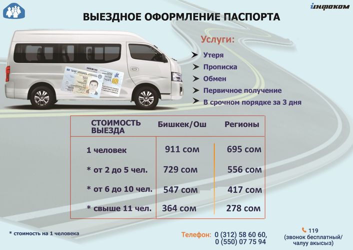 Стоимость услуги по выездному оформлению паспорта в Бишкеке и Оше подешевела на 700 сомов и составляет 911 сомов за один выезд.