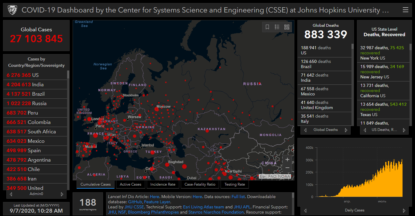 Всего в мире коронавирусом заразились 27 миллионов 103 тысячи 845 человек. Больше всего зараженных в США (6 миллионов 276 тысяч 365), Индии (4 миллиона 204 тысячи 613), Бразилии (4 миллиона 137 тысяч 521), России (1 миллион 22 тысячи 228), Перу (683 тысячи 702), Колумбии (666 тысяч 521), Южной Африке (638 тысяч 517), Мексике (634 тысячи 23) и Испании (498 тысяч 989).