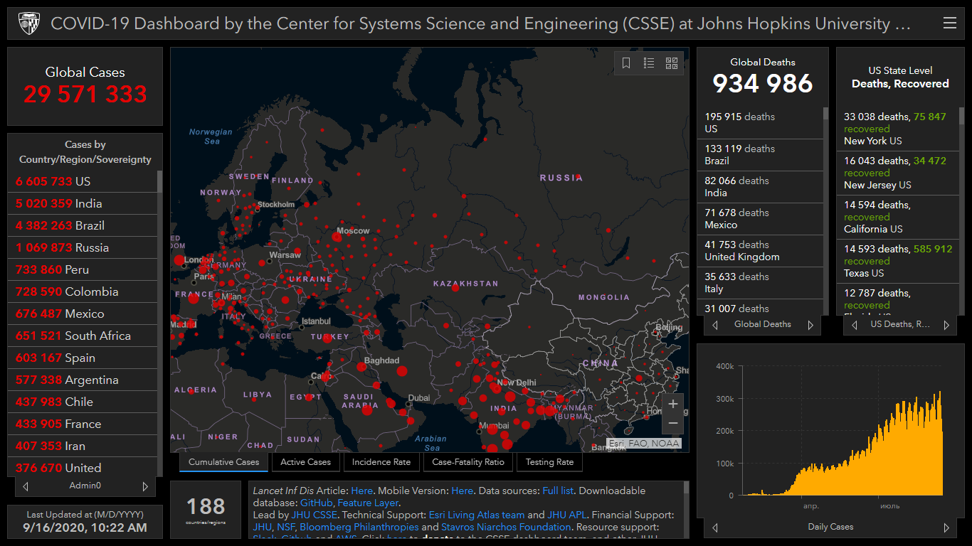 Всего в мире коронавирусом заразились 29 миллионов 571 тысяча 333 человека. Больше всего зараженных в США (6 миллионов 605 тысяч 733), Индии (5 миллионов 20 тысяч 359), Бразилии (4 миллиона 382 тысячи 263), России (1 миллион 69 тысяч 873), Перу (733 тысячи 860), Колумбии (728 тысяч 590), Мексике (676 тысяч 487), Южной Африке (651 тысяча 521) и Испании (603 тысячи 167).