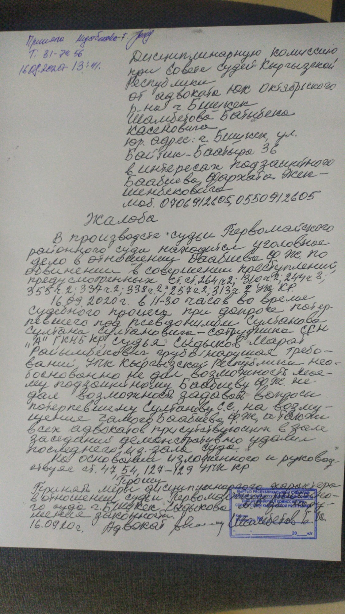 Бакытбек Шамбетов отмечает, что судья принял необоснованное и предвзятое решение. Он просит дисциплинарную комиссию Совета судей привлечь Марата Сыдыкова к ответственности и отстранить от разбирательства.