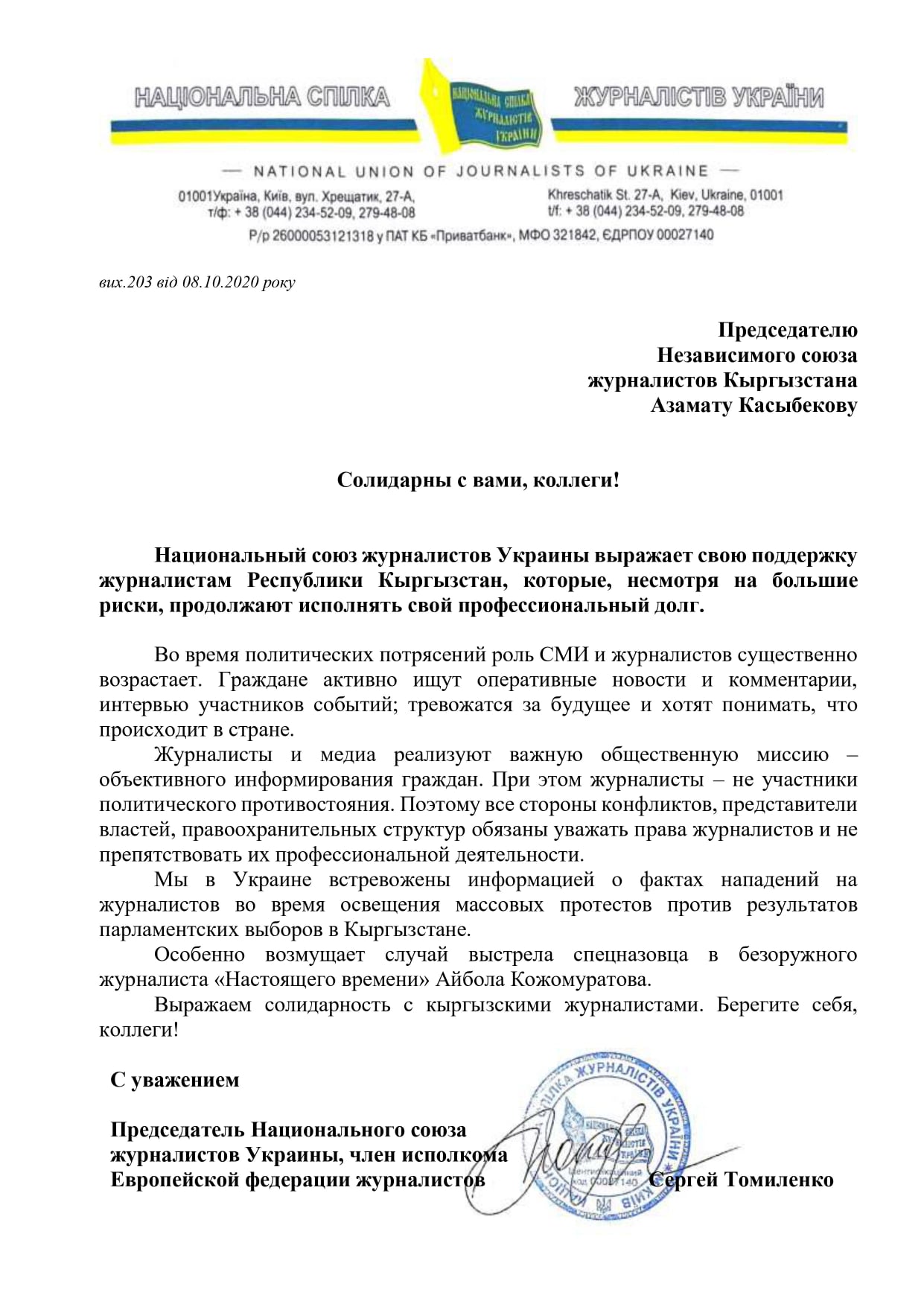 Текст обращения председателя Национального союза журналистов Украины, члена исполкома Европейской федерации журналистов Сергея Томиленко отправлен в Независимый союз журналистов Кыргызстана.