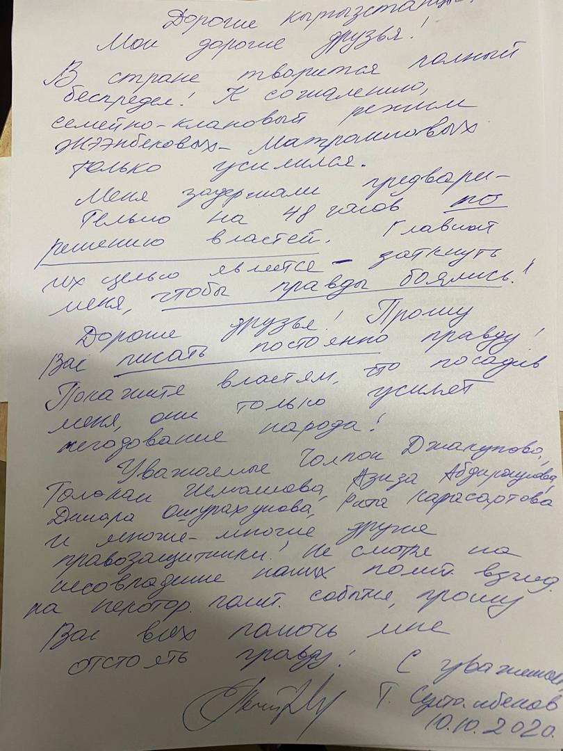 «Уважаемые Чолпон Джакупова, Рита Карасартова, Азиза Абдирасулова, Динара Ошурахунова и многие другие! Прошу вас помочь мне отстоять правду, несмотря на несовпадение наших политических взглядов», — написал Темирлан Султанбеков.