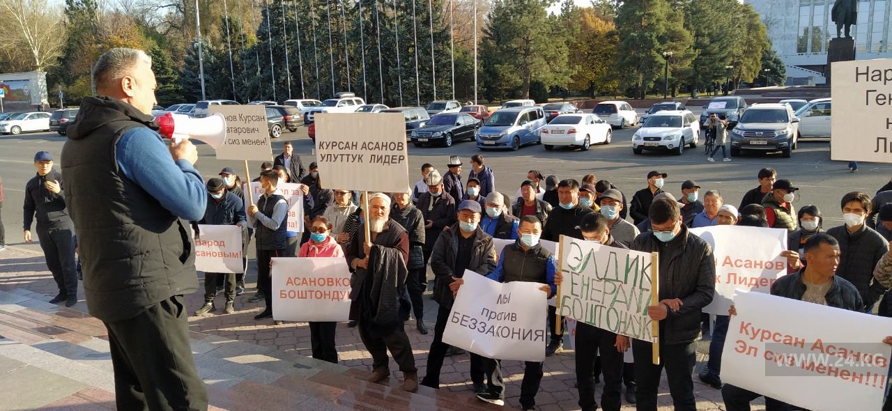Митингующие обращаются к и. о. президента Садыру Жапарову с требованием освободить Курсана Асанова. По их мнению, он арестован незаконно. На акции собралось около ста человек. Некоторые пришли с детьми. Собравшиеся развернули плакаты с надписями «Руки прочь от генерала Асанова» и «Асанов — народный генерал».