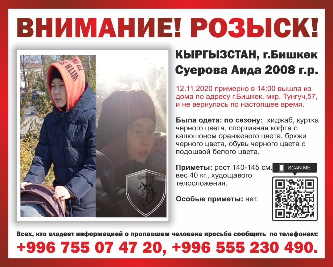 В Бишкеке добровольный отряд спасателей ведет поиски без вести пропавшей 12-летней Аиды Суеровой. Об этом 24-kg.com сообщила координатор отряда Катерина Клевакова.