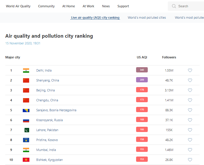 В рейтинге крупнейших городов мира по качеству воздуха World Air Quality на 19.30 Бишкек поднялся на 10-е место.