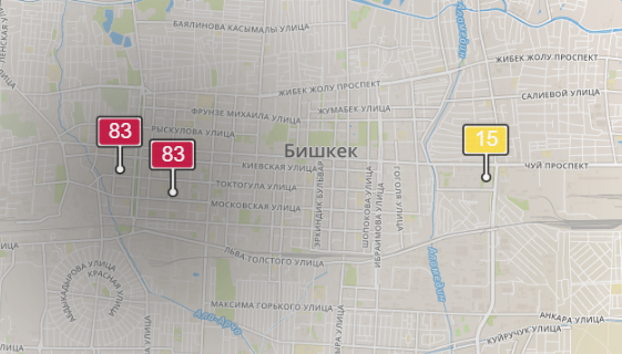 - в районе улиц Бейшеналиевой/Токтогула. Уровень загрязнения превышен в 1,6 раза: PM2.5 среднесуточный — 56 мкг/м³, на момент измерения — 83 мкг/м³;