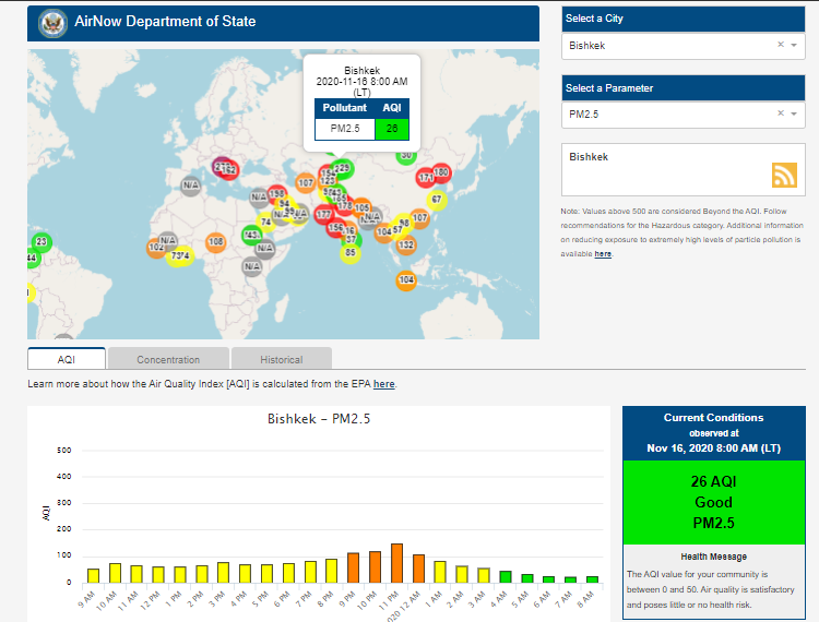 Посольство США в Кыргызстане также установило датчик. Он показывает индекс качества воздуха в режиме онлайн. Информация обновляется ежечасно.
