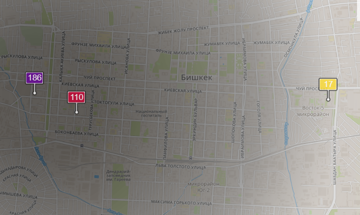 - в районе улиц Бейшеналиевой/Токтогула. Уровень загрязнения превышен в 3,74 раза: PM2.5 среднесуточный — 130 мкг/м³, на момент измерения — 186 мкг/м³;