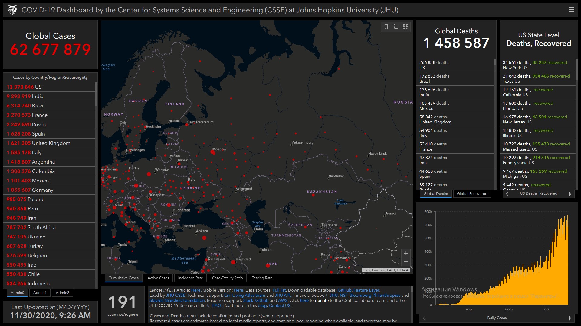 Всего в мире коронавирусом заразились 62 миллиона 677 тысяч 879 человек. Больше всего зараженных в США (13 миллионов 378 тысяч 846), Индии (9 миллионов 392 тысячи 919), Бразилии (6 миллионов 314 тысяч 740), Франции (2 миллиона 270 тысяч 573), России (2 миллиона 249 тысяч 890), Испании (1 миллион 628 тысяч 208), Великобритании (1 миллион 621 тысяча 305), Италии (1 миллион 585 тысяч 178), Аргентине (1 миллион 418 тысяч 807) и Колумбии (1 миллион 308 тысяч 376).
