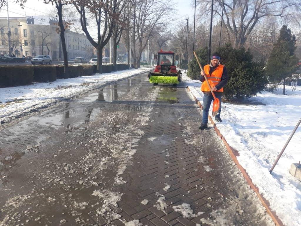 Скользкие тротуары в центре Бишкека почистили. Об этом 24-kg.com сообщили в пресс-службе мэрии столицы.
