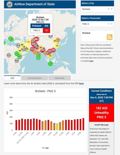 Посольство США в Кыргызстане также установило датчик. Он показывает индекс качества воздуха в режиме онлайн. Информация обновляется ежечасно.