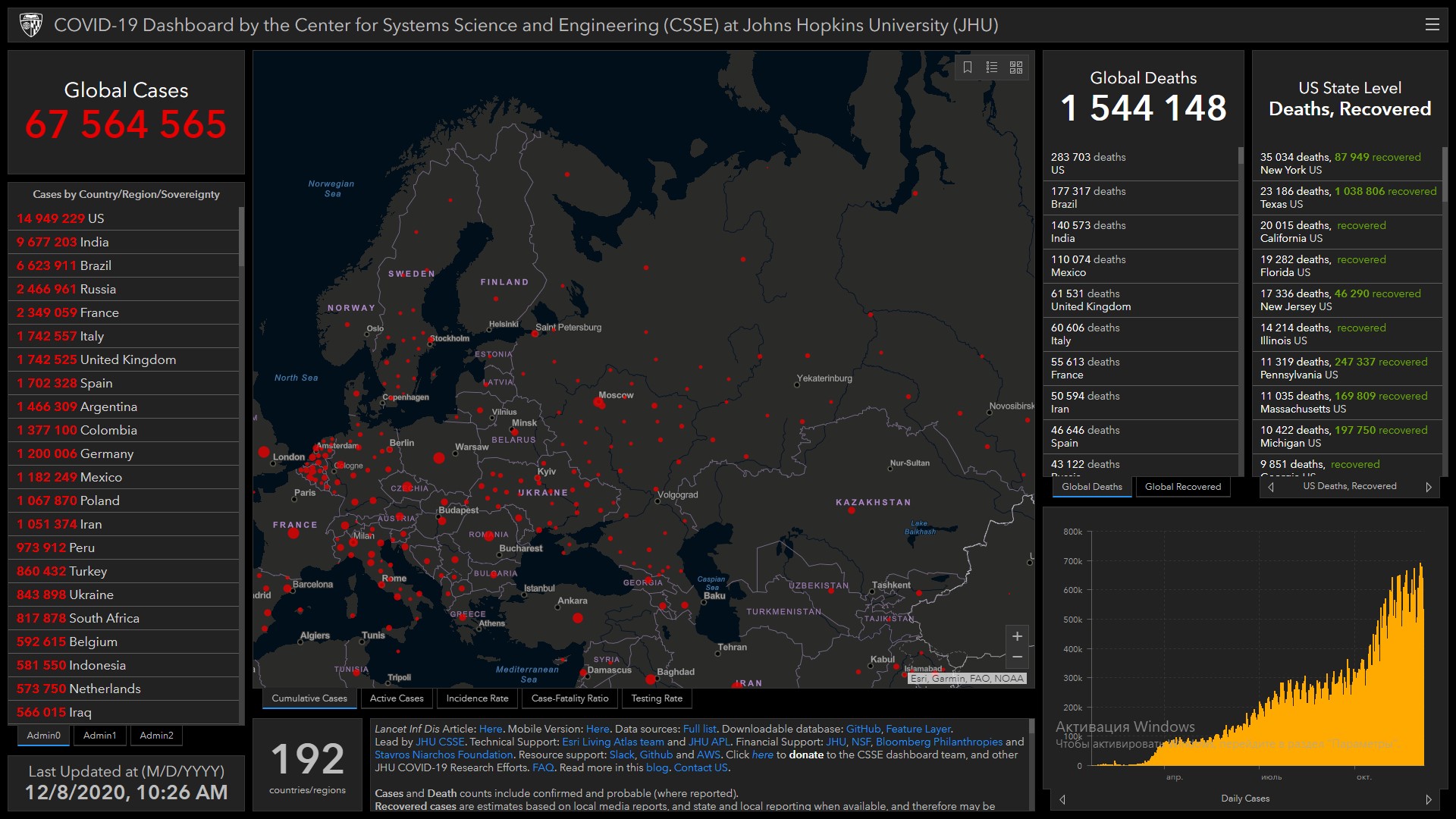 Всего в мире коронавирусом заразились 67 миллионов 564 тысячи 565 человек. Больше всего зараженных в США (14 миллионов 949 тысяч 229), Индии (9 миллионов 677 тысяч 203), Бразилии (6 миллионов 623 тысячи 911), России (2 миллиона 466 тысяч 961), Франции (2 миллиона 349 тысяч 59), Италии (1 миллион 742 тысячи 557), Великобритании (1 миллион 742 тысячи 525), Испании (1 миллион 702 тысячи 328), Аргентине (1 миллион 466 тысяч 309) и Колумбии (1 миллион 377 тысяч 100).