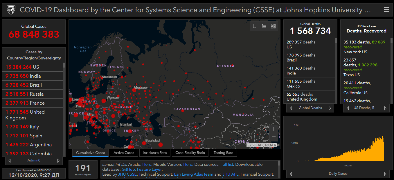 Всего в мире коронавирусом заразились 68 миллионов 848 тысяч 383 человека. Больше всего зараженных в США (15 миллионов 384 тысячи 264), Индии (9 миллионов 735 тысяч 850), Бразилии (6 миллионов 728 тысяч 452), России (2 миллиона 518 тысяч 551), Франции (2 миллиона 377 тысяч 913), Великобритании (1 миллион 771 тысяча 545), Италии (1 миллион 770 тысяч 149), Испании (1 миллион 712 тысяч 101), Аргентине (1 миллион 475 тысяч 222) и Колумбии (1 миллион 392 тысячи 133).