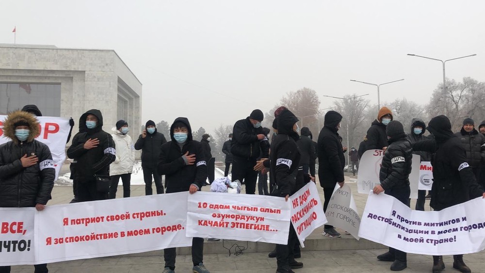 На митинг против митингов вышли представители общественных объединений «Убакыт-Время», «ЦИМ» и «Спартак». Их беспокоит то, что люди объединяются небольшими группами и выходят на митинги. Представители движений считают, что это плохо сказывается на имидже Кыргызстана, и предложили и. о. мэра Бишкека Балбаку Тулобаеву выделить специальное помещение для желающих митинговать.