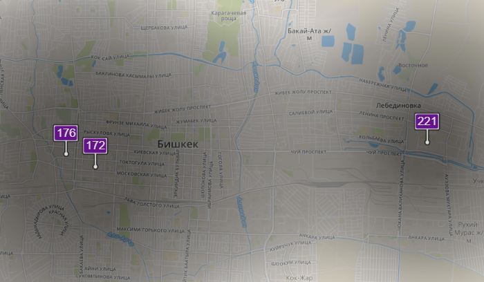 - в районе улиц Бейшеналиевой/Токтогула. Уровень загрязнения превышен в 3,85 раза: PM2.5 среднесуточный — 135 мкг/м³, на момент измерения — 176 мкг/м³;