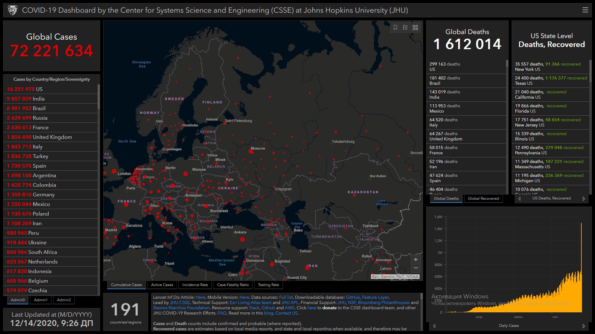 Всего в мире коронавирусом заразились 72 миллиона 221 тысяча 634 человека. Больше всего зараженных в США (16 миллионов 251 тысяча 975), Индии (9 миллионов 857 тысяч 29), Бразилии (6 миллионов 901 тысяча 952), России (2 миллиона 629 тысяч 699), Франции (2 миллиона 430 тысяч 612), Великобритании (1 миллион 854 тысячи 490), Италии (1 миллион 843 тысячи 712), Турции (1 миллион 836 тысяч 728), Испании (1 миллион 730 тысяч 575), Аргентине (1 миллион 498 тысяч 160) и Колумбии (1 миллион 425 тысяч 774).
