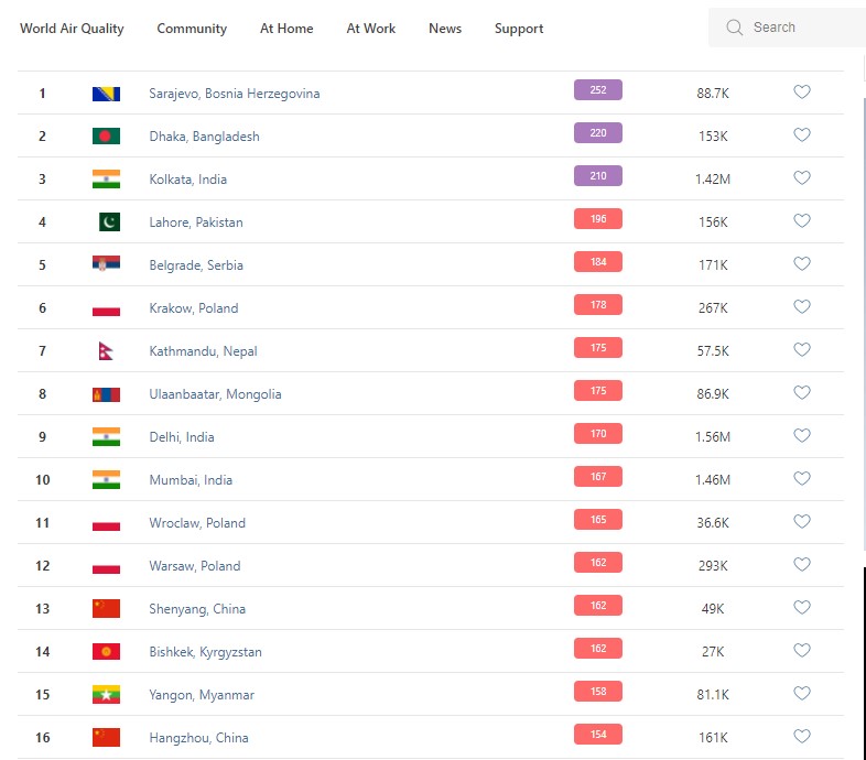В рейтинге крупнейших городов мира по качеству воздуха World Air Quality Бишкек на 8.30 опустился на 14-е место.