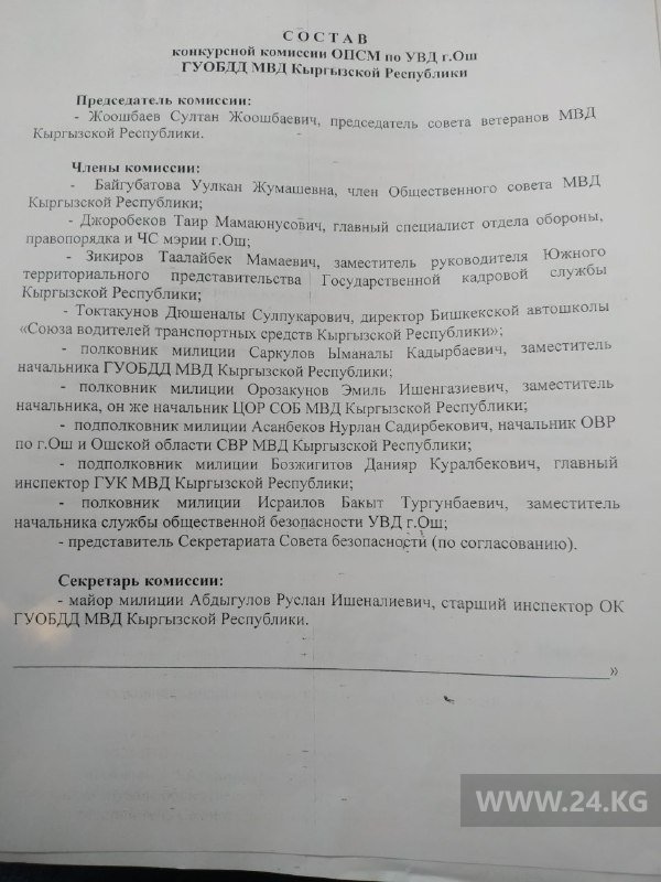 Отметим, накануне экс-председатель Тамерлан Ибраимов заявил, что в южной столице поменялся состав отборочной комиссии, однако его в известность не поставили. Ранее в МВД 24-kg.com отказали предоставить список.