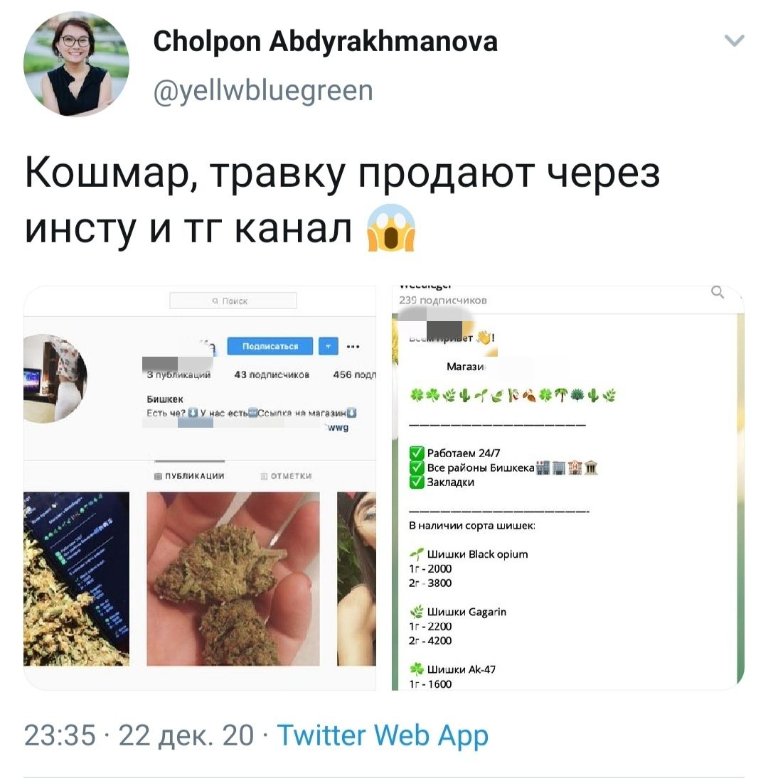В соцсетях продают наркотические средства. Об этом написала на своей странице пользовательница Twitter Чолпон Абырахманова.