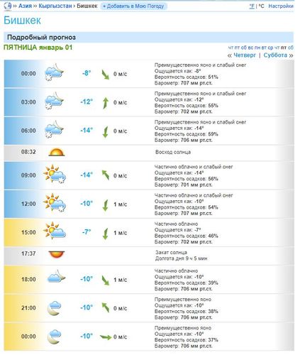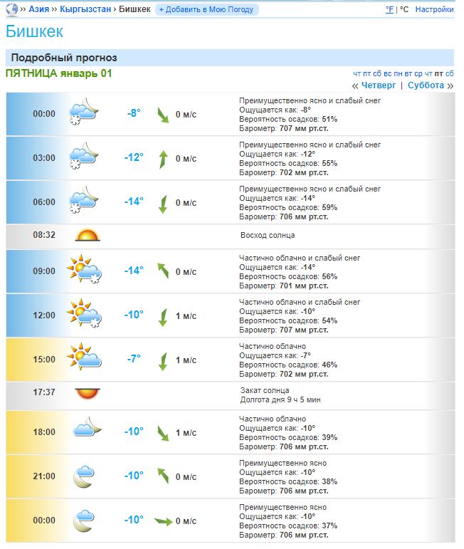 Днем 31 декабря без осадков, столбик термометра поднимется до −5 градусов. 1 января в первой половине дня также возможен слабый снег.